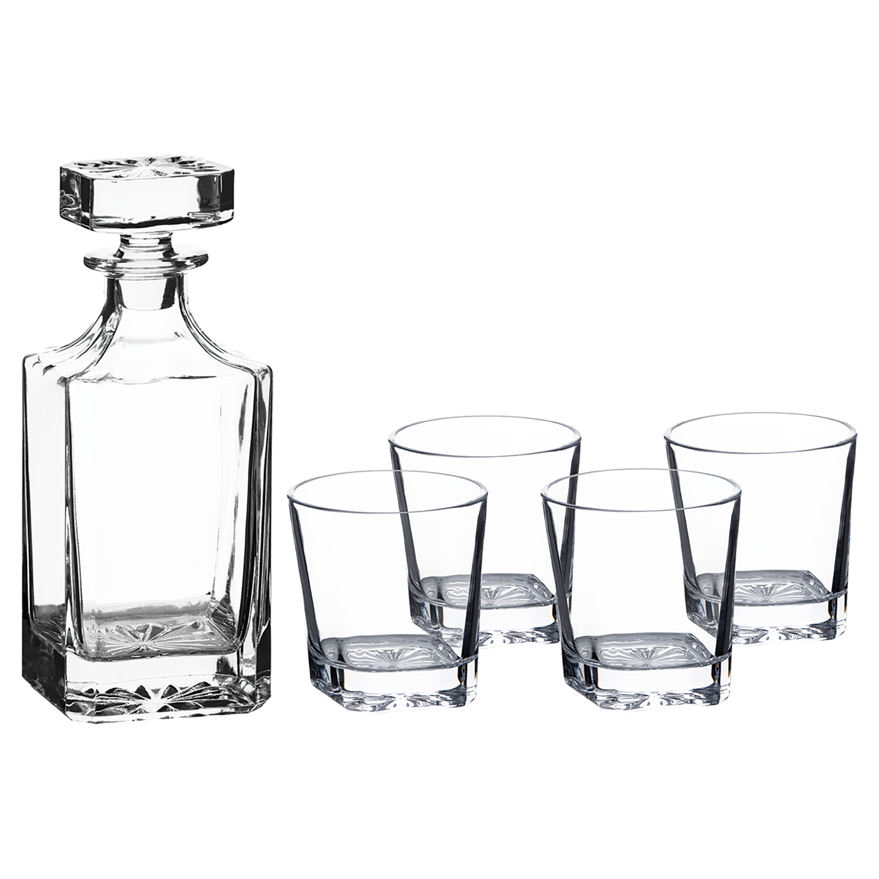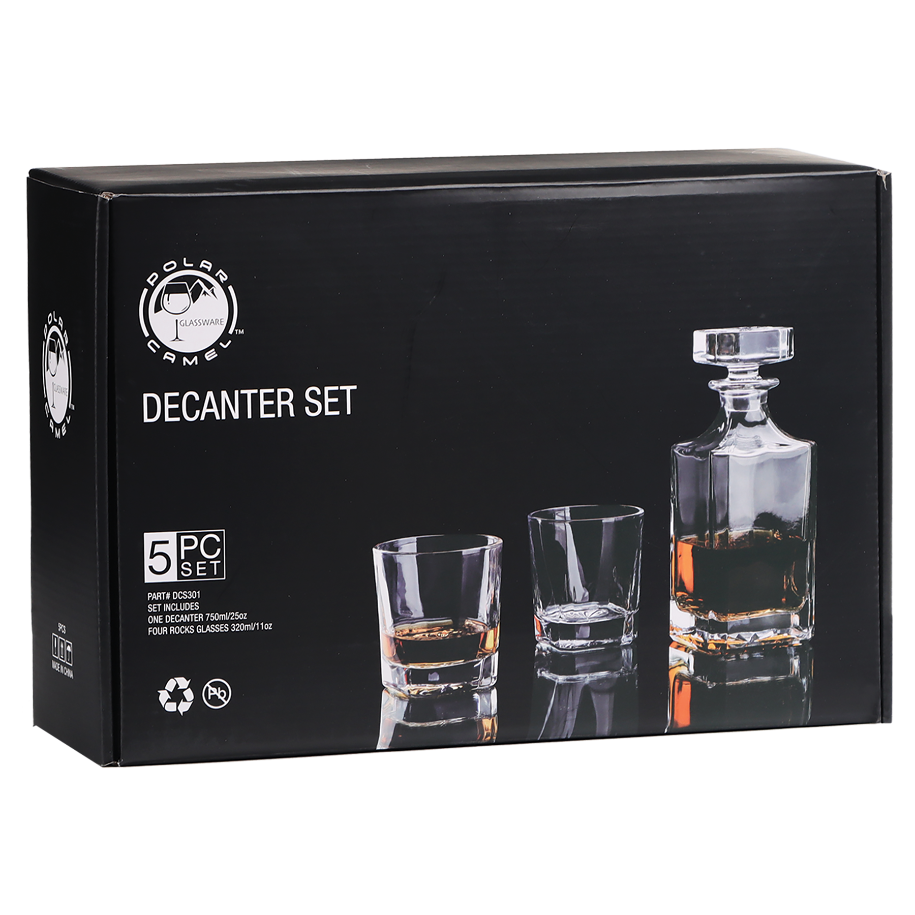 Polar Camel 750mL Square Glass Decanter Set with four 11 oz. Rocks Glasses in Black Gift Box Printed Paper Sleeve. This decanter set includes a square decanter with a stopper lid and four 11oz rocks glasses. The decanter, lid and glasses can be personalized. This set is packaged in a gift box with EVA foam for protection.