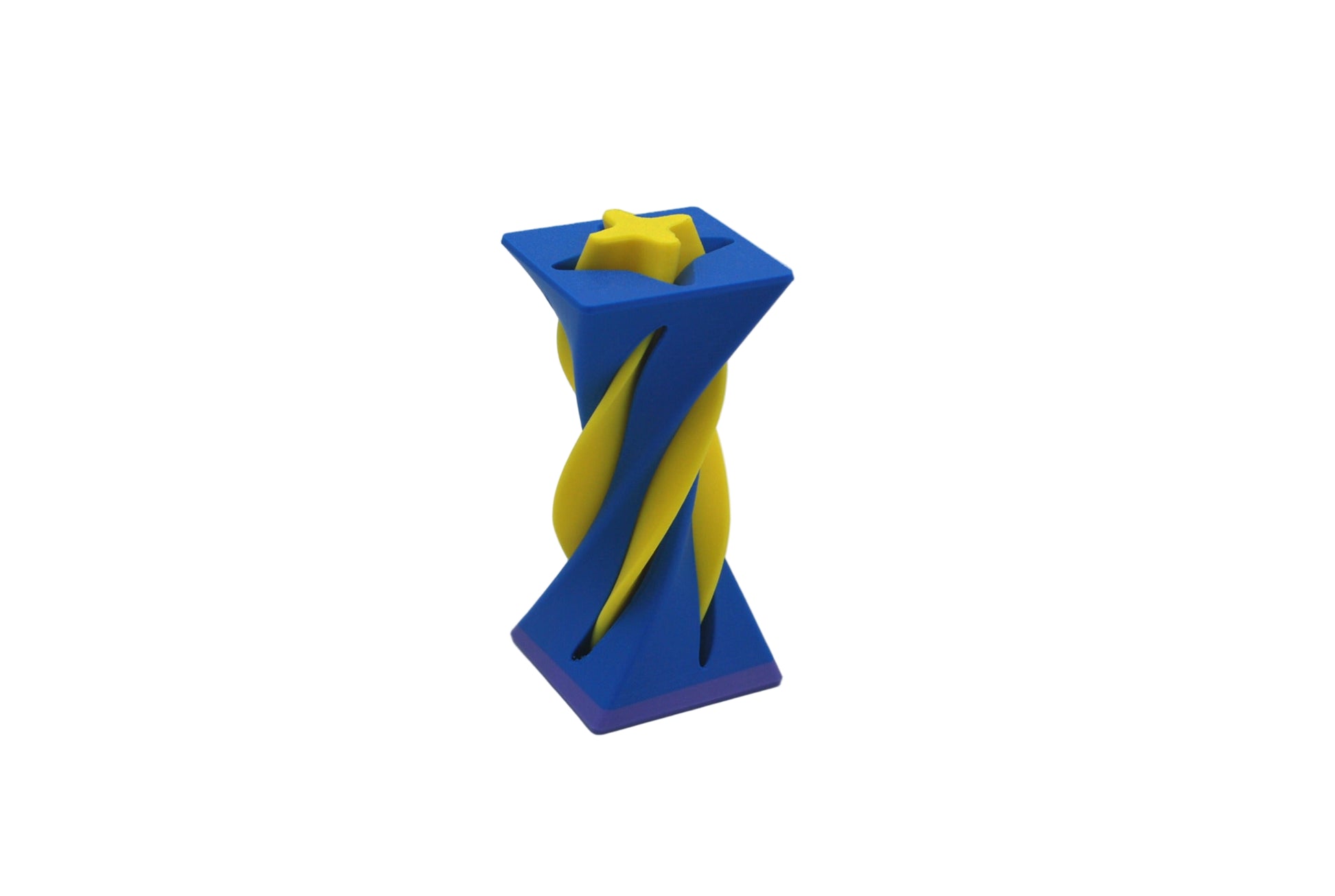 If you just can't sit still, here is something to keep your hands moving. This fidget toy is made of two pieces, with one sliding inside the other. This item is made of yellow, blue and purple filament.