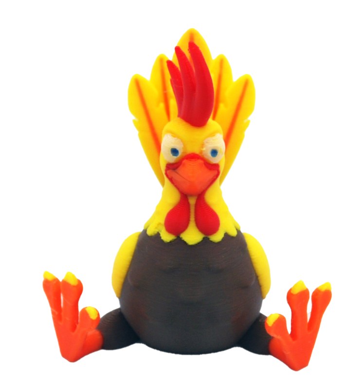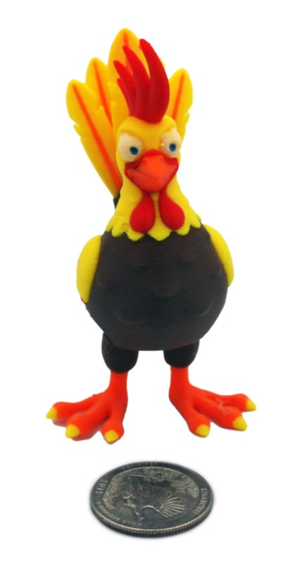 The mini rooster is admirable. This rooster has articulating legs. He is printed from brown, orange, yellow and red filament. The blue eyes are painted with acrylic paint.