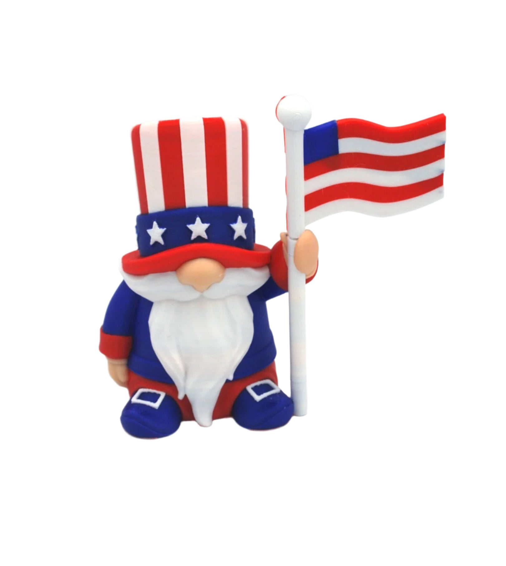 This patriotic gnome is made out of red, white, blue and beige PLA filament. You can use him to add a touch of patriotism to your indoor garden or as part of your festive center piece.
