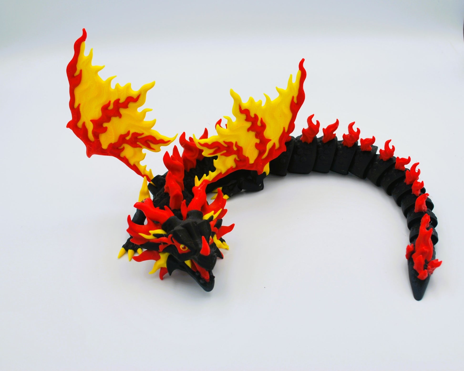 Full articulating dragon. His mouth, body, legs and tail all move. 3D printed from PLA filament. There is no painting on this item.