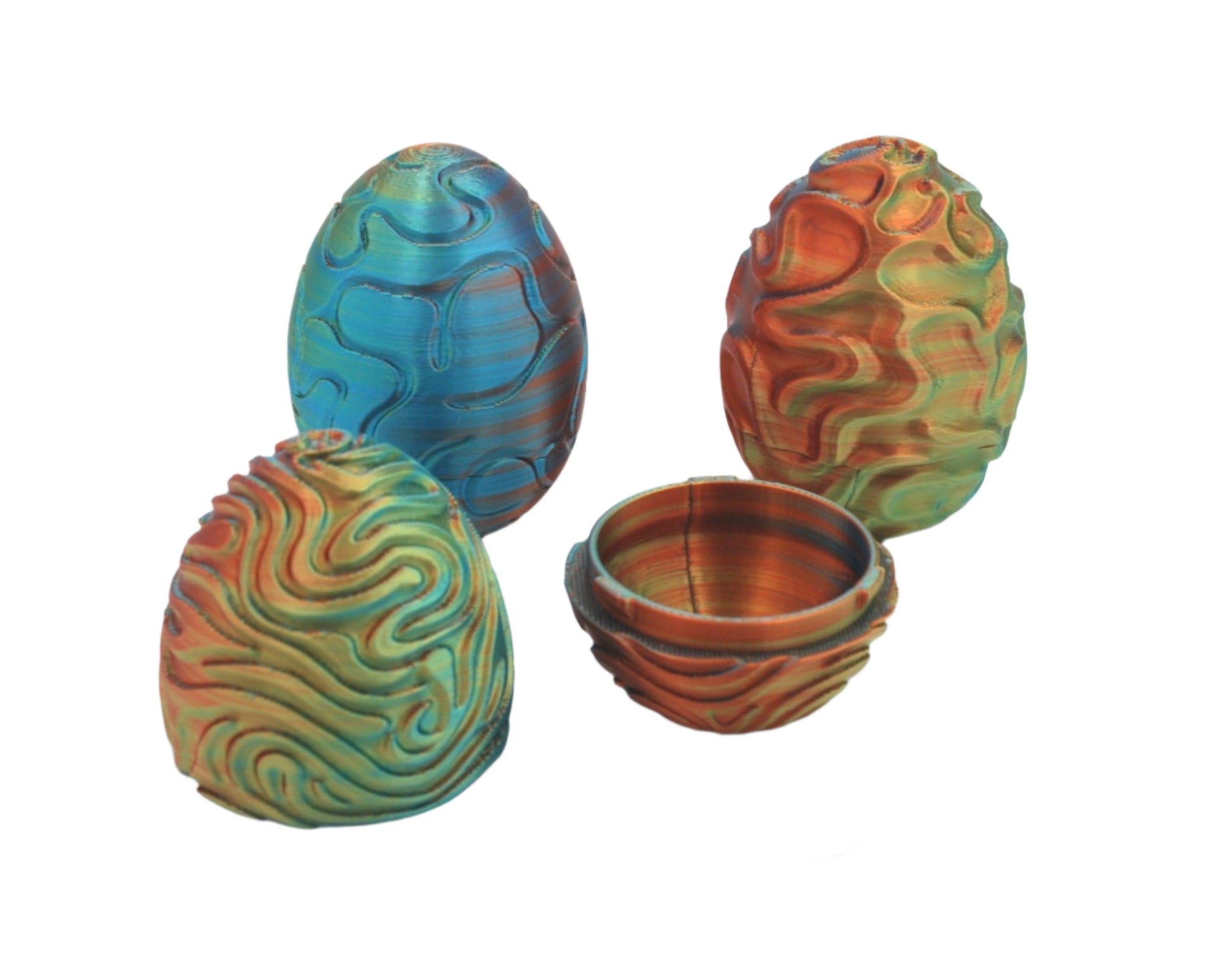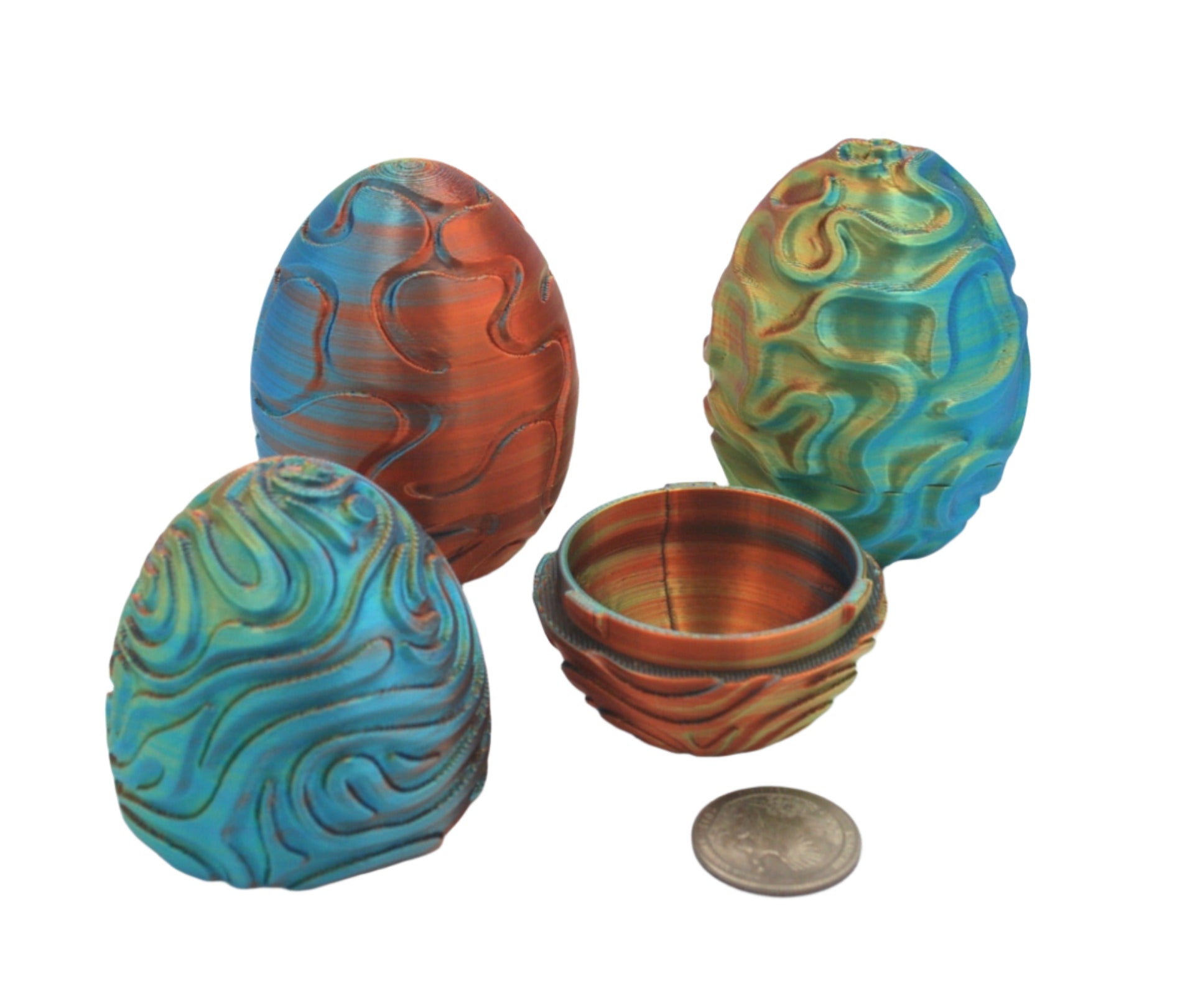 This surprise egg can is a unique way to give some special a small item. This item is made from a gold, blue, and cooper silk filament. The price is per egg.